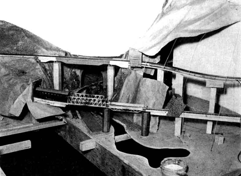 Ik mikte een zak vol in een bak, droge poederverf erbij en een fikse scheut terpentine eroverheen. Roeren, laten drogen en klaar is mijn grint! En komt er eens een stukje van dit papieren grint tussen de loc-raderen, dan wordt dat wel fijngemalen zonder schade aan de fijne tandwielen te doen. Soms — om het niet al te eentonig te laten worden — meng ik er wel eens een zakje heel fijn gemalen kurk door en langs de emplacementsporen strooi ik bijna zwart geverfd, heel fijngezeefd zaagsel.