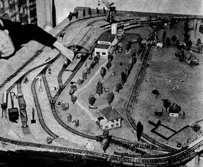 Imitatie gras heb ik ook maar een paar keer gekocht, want ik had gauw door, dat dat ook makkelijk zelf te maken is. Ook weer: van zaagsel. De timmerman bij mij in de buurt vindt het best, dat ik dat bij hem weghaal. Door een oude Tomado-zeef, ’n scheut beits (z.g. buitenbeits), goed roeren en laten drogen. Ik gebruik alleen het fijnste, meerdere malen uitgezeefde zaagsel. Een kleinere hoeveelheid verf ik enigszins geel, en dat wordt gemengd door het groene gras, anders wordt het al te groen en te eentonig. Langzamerhand kreeg ik de échte „treintjes-gekken” mentaliteit! Zo ontdekte ik de snoepjespapiertjes! Ideaal te gebruiken als glasgordijnen van miniatuur-huisjes! En waarom zou ik niet echt cement gebruiken als iets van beton moet zijn? Een muur dik met „Cetaflex” insmeren. Niet laten drogen, maar dadelijk bestrooien met cement (wel voorzichting zijn: het spul stuift gemeen, dus eerst oude kranten op de werktafel). Dan laten drogen en het niet vastgeplakte cement eraf schudden. Is het niet dik genoeg? Dan de bswerking herhalen. Dan wordt de muur juist mooi onregelmatig. Tè eentonig van kleur? Voorzichtig met donkere of lichtere verf bijwerken. Het beton gaat er dan mooi „verweerd” uitzien. De verf wel heel dun opbrengen!