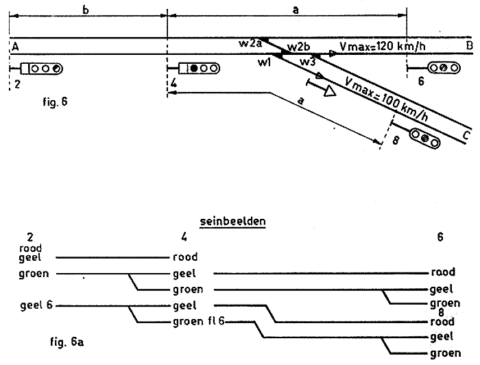 Fig. 6a - Deze beelden wijzigen niet, indien de snelheid voor recht spoor (naar B) een andere is dan 120 km/h. Als b.v. wissel 1 in de +-stand slechts met max. 40 km/h mag worden bereden verandert in sein 2: Geel 6 in Geel 4; verandert in sein 4: Groen flk 6 in Groen flk 4.