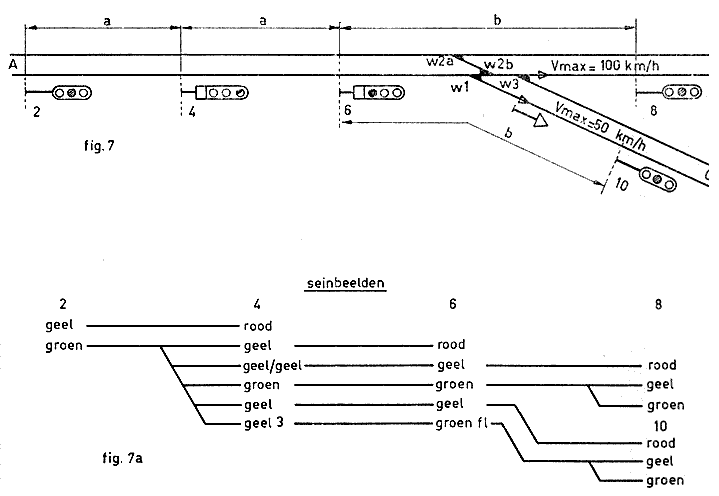 Onder, in fig 6a, zijn de verschillende seinbeelden aangegeven; de afhankelijkheid van de opeenvolgende seinbeelden d.m.v. de horizontale verbindingslijnen.
