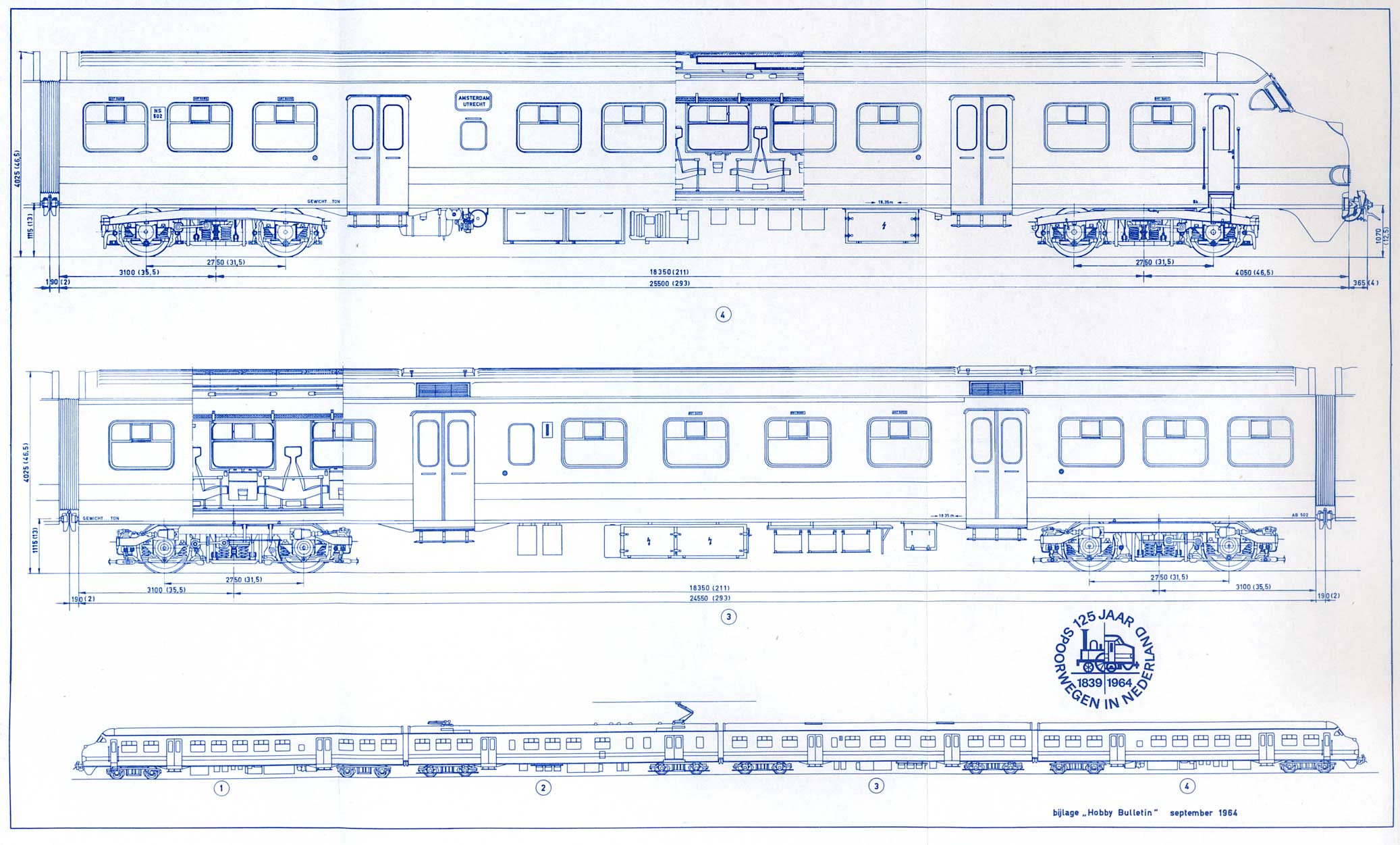 Zoals reeds gezegd, wil ook Hobby Bulletin een bijdrage leveren ter herdenking van het 125-jarig bestaan van onze spoorwegen. In onze onschuld leek het ons een aardige gedachte de oudste vierwagentrein met elektrische aandrijving in ons land te vergelijken met het nieuwste model. Onze NS zou onze NS niet zijn, als ze ons daarbij niet op alle mogelijke manieren behulpzaam wilden zijn. Prachtige tekeningen van het oudste elektrische materieel werden uit stoffige archieven opgediept en trein TT (nieuwste model) leverde eveneens geen moeilijkheden op. Dat onze uitgever een uitstekende tekenkamer heeft, heeft u zonder twijfel al dikwijls gemerkt. Dat daar ook wel eens tekenaars met vacantie willen is even duidelijk en zodoende liepen door allerlei tegenslagen da verschillende plannen in het honderd. Tot een oplossing kon een en ander wel gebracht worden, zij het met enkele concessies.