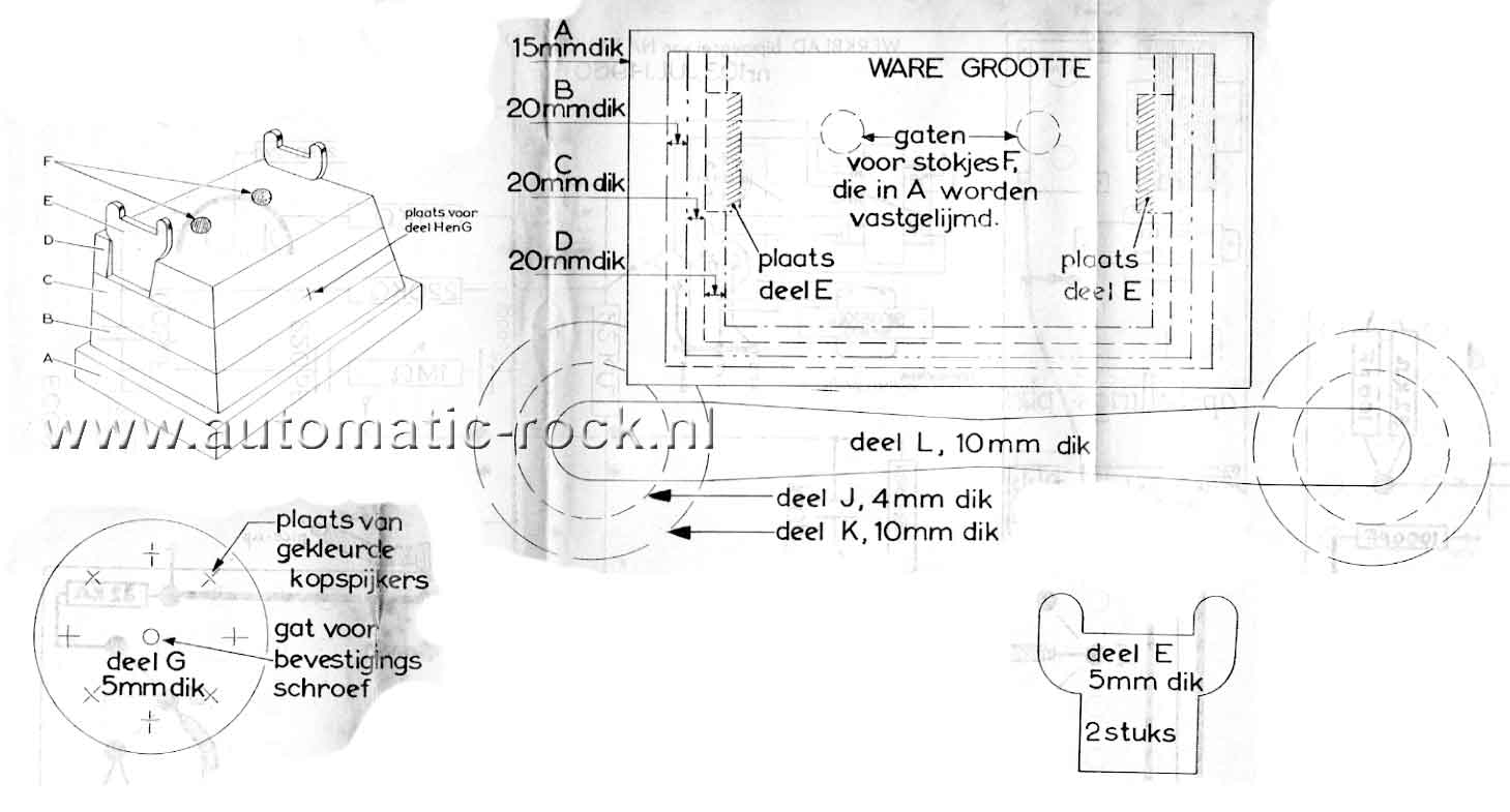 Met lijm en spijkers zetten we deze steunen vast. De kiesschijf (G) bespijkeren we met de 8 kopspijkers. Aan de achterzijde lijmen we op het midden deel H. Met de houtschroef, die in een door G en H geboord gat wordt gestoken, schroeven we de kiesschijf tegen de voorzijde van het middelste blok. De hoorn maken we van de delen J, K en L. Het latje (L) zagen we in de vorm als de tekening op het werkblad aangeeft. Op de uiteinden van L lijmen we de delen J en K (zie tekening). We kunnen de hoorn verbinden met een spreekdraad aan het toestel, maar dan is het toestel niet meer zo gemakkelijk uit elkaar te halen.