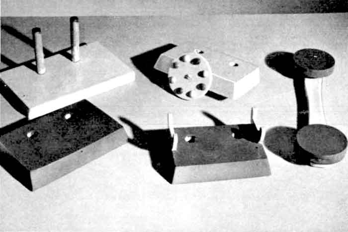 Misschien is mdf geschikter als materiaal vanwege de kosten, en makkelijker te verwerken en af te werken.Deze telefoon is opgebouwd uit losse delen, die door middel van houten pennen bij elkaar gehouden worden. In plank A boren we, zoals de tekening aangeeft, twee gaten van 12 mm 0. Hierin lijmen we de beide stokjes F. De drie stapelblokken zagen we tegelijk in vorm. We spijkeren ze tijdelijk op elkaar of klemmen ze vast met lijmtangen. Op de bovenste tekenen we de maat af 110x70 mm (zie tekening). Op de onderste de maten 140 x 80 mm. We halen de lijnen nu over het gehele blok en zagen de drie kanten schuin af. Dan boren we door de drie plankjes de gaten, waardoor de stokjes F komen. Pas daarna maken we de blokken weer los. In het bovenste blok maken we inkepingen voor de steunen (E).