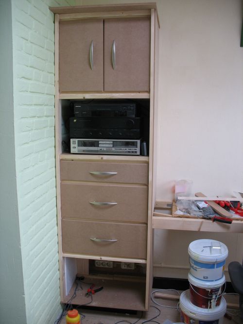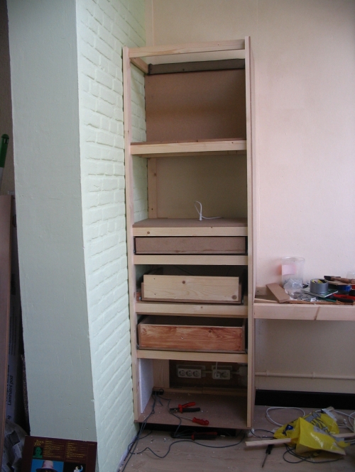 De plaat bovenop, het plafond van de kast als het waren, is maar een losse plaat. De uiteindelijke plaat die er op komt wordt dikker, en passen