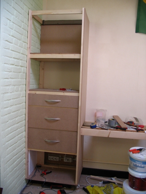 De lades zelf worden gemaakt van resthout van eerdere projecten uit m'n vorige huis. Je ziet oa een deel van m'n oude tv kast.